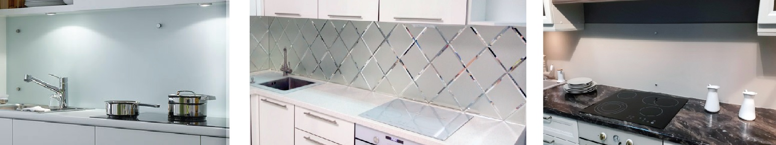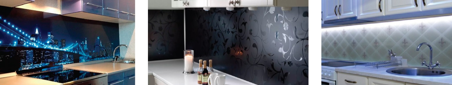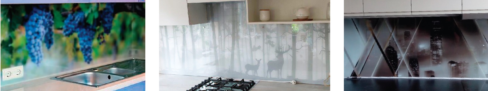 Прекрасным дополнением служат ультрафиолетовая печать, покраска и так же алмазная обработка стекла посредством нанесения линий "V" или "U" образных - гравировка. Скинали с гравировкой - уникальный продукт, способный дополнить самые изысканные дизайнерские проекты. Универсальность продукта в том, что она может применяться для всей линейки стеновых панелей независимо от способа крепления. Скинали с однотонной покраской или уф-фотопечатью благодаря гравировке приобретают дополнительный рельеф, что придает им визуальное сходство с плиткой.