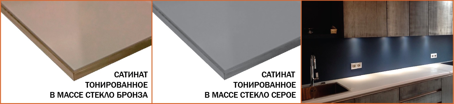 Матовая, шелковистая поверхность тонированного в массе стекла, имеет эффект сияющей дымки, позволяет зрительно увеличить пространство, создавая идеальный фон для подчеркивания остальных деталей интерьера.